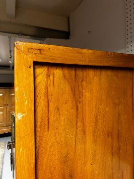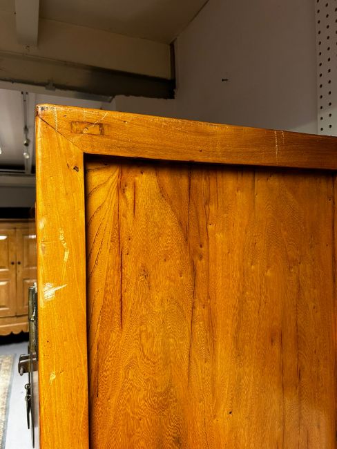 A pair of Chinese Qing Dynasty elm inspired marriage two door wardrobes. Each having a straight top over twin brass hinged doors with large brass escutcheon with pin lock. The doors opening to reveal a fully appointed interior with shelving and banks of drawers. Geometric carved apron below, raised on straight squared supports. Measures approx. 193cm x 102cm x 62cm.