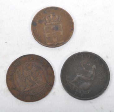 A collection of 18th century and later foreign and United Kingdom uncirculated currency coins. To include, George III 1799 half penny, 1821 silver full crown, 1837 Greece 10 Lepta coin, three full crowns, 1806 penny and a few other examples.