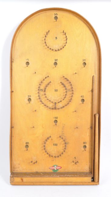 A vintage mid 20th century Glevum Bagatelle marble / ball bearing board puzzle game. With curved top, with push ball bar with nails and holes to scoring points. Measures approx. 60cm tall.