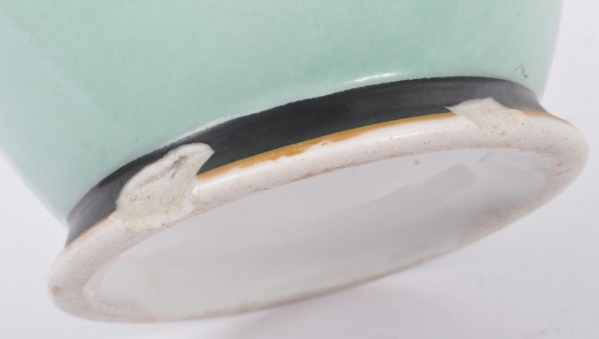 A pair of 19th century Victorian Staffordshire mantel / table vases. Having a shaped rim, twin handle in a circular body atop a round base. Hand painted decoration blue / green ground with panel of 17th century figures. Chips present to rim and base, no stamps to base. Measures approx. 21cm tall.