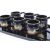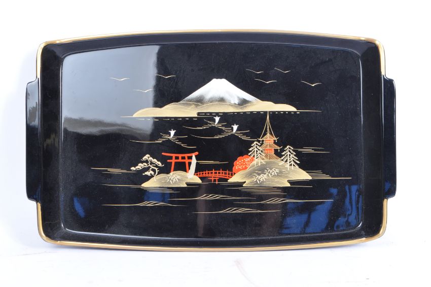 A vintage 20th century cocktail drinks set. Comprising of a cocktail shaker with stemmed drinking glasses. Together with a set of six handled drinking mugs / cups. Both in black ground with gilt painted decoration of Asian landscape scenes. Both housed in hinged cases decorated in faux crocodile paper.