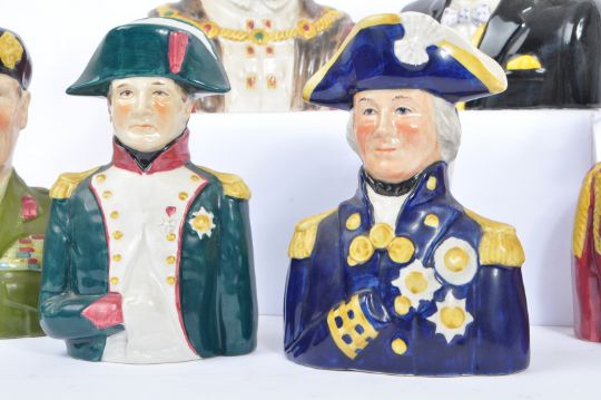 A collection of six 20th Century porcelain 'Pride of Britain' series ceramic Toby jugs by Wood & Sons (HJ Wood), England. To include, Sir Winston Churchill, Lord Nelson, Napoleon Bonaparte, Lord Montgomery, Duke of Wellington and Henry VIII. All Marked to base. Largest measures 17.5cm (height).
