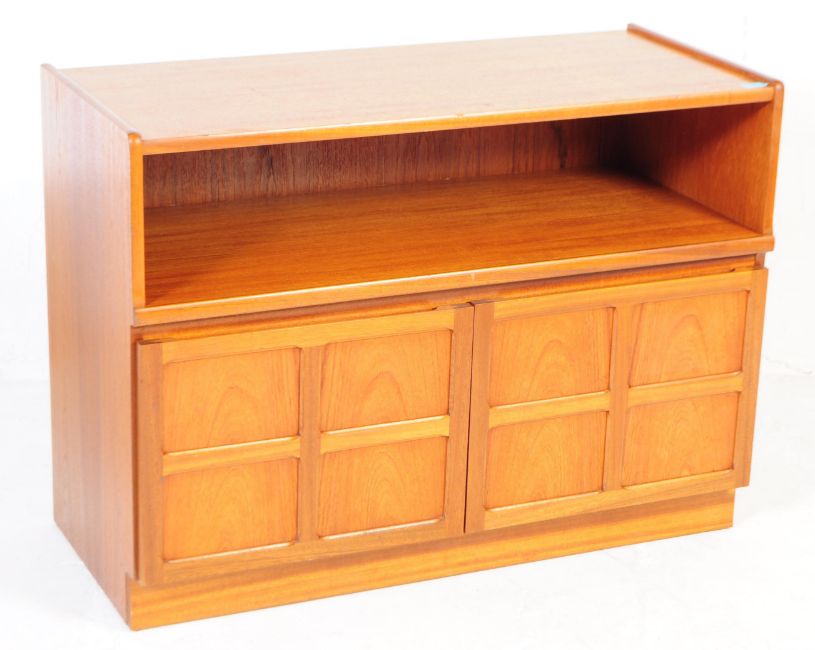 Nathan - Squares - A retro vintage circa 1960's British teak sideboard. Having a twin pair of square front cupboard doors underneath an open shelf with gallery top. . Measures approx. 75cm x 102cm x 45cm