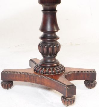 A 19th century William IV rosewood games / card fold over table. The table having a rounded rectangular top with shaped frieze below raised on chunky turned column with hinged folding top revealing a red inline red velvet top. Supported upon a quadruped base raised on carved bun feet. Measures approx 76 x 92 x 46 cm.