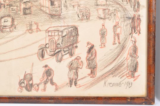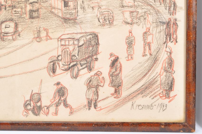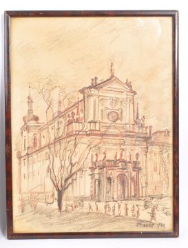 Helmut Krommer (1891-1973) An Eastern European church, signed and dated 1942, charcoal and sepia crayons, 42 x 31.5cm; and companion of a continental city street.