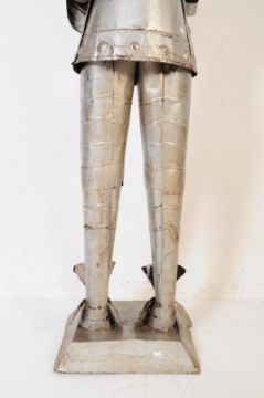 A mid 20th Century scratchbuilt medieval 3/4 length of full armour. Made from aluminium metal with a stainless steel headdress. Raised on a rectangular base. Measures approx; 160 x 56 cm.