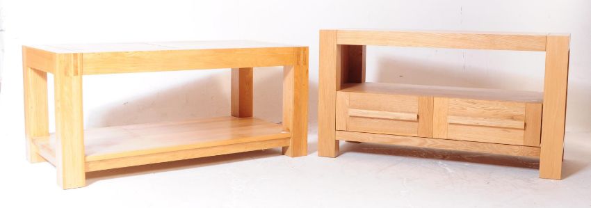 A contemporary Oak Furniture Land coffee table and TV stand. Both of rectangular form, coffee table raised on square wooden supports with two tier design. TV stand with storage to centre and double drawer with wooden handle configuration to lower tier. Measures approx. 55x100x43cm
