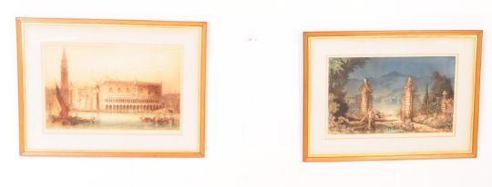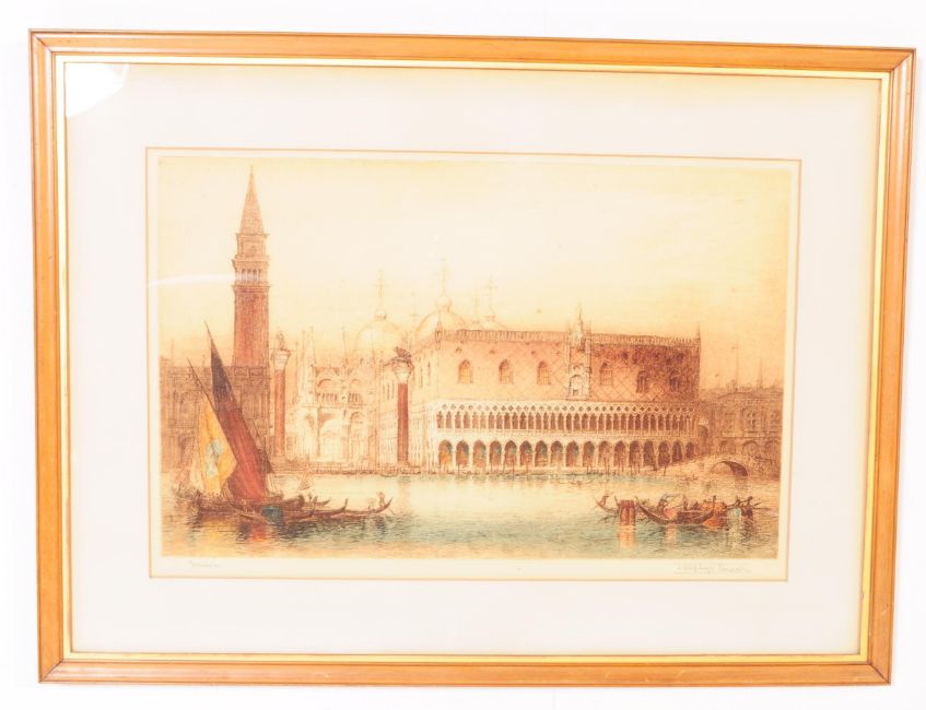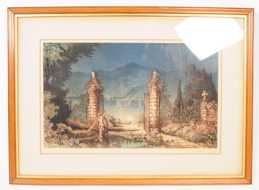 James Alphege Brewer (1909-1938) - Two early 20th century colour etchings by James Alphege Brewer. One titled 'Venice' and 'Lake Como' (From the Villa Colotto), both signed in pencil, one bearing blind stamp. Both measure 83cm x 61cm