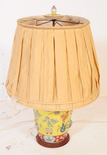 A matching pair of early 20th century 1930s Chinese ceramic table lamps converted from vase form. Each having hand painted and raised decoration vignettes to body in the form of vases, fruit, insects amongst other topics. With dual bulb brass fittings to each lamp. In a yellow colourway and raised on a wooden plinth bases, original shades and original vase lids present. Measures 70cm (height).