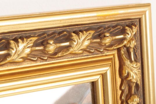 A large contemporary gilt framed bevelled edge overmantle wall mirror. Of rectangular form, the bevelled edge mirror set within composite gilt decorated frame. Having carved foliate decoration border to the frame. Measures approx 130 x 101 cm.