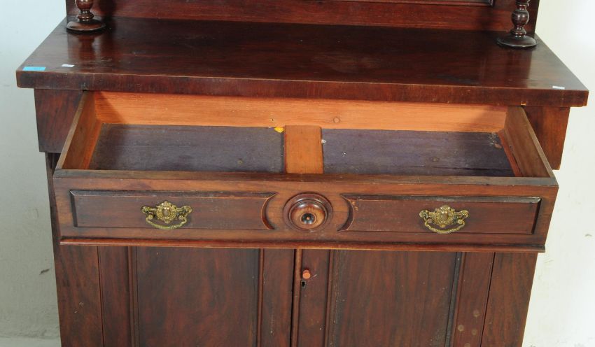 A 19th century Victorian mahogany chiffonier sideboard. The cabinet having a raised single tier chiffonier gallery back, with carved eagle decoration mounted atop and a single shaped shelf raised on turned columns below. With two cupboard doors to the front, below two drawers having brass handles, the sideboard raised on a plinth base. Measures approx 163 x 105 x 42 cm.
