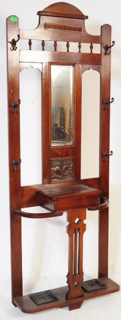 Victorian 19th century mahogany hall stand. The hall stand with a central glove box drawer in front of an upright back comprising dressing mirror, series of hanging hooks etc. The base with trip trays. Either side of the glove drawer being stick stands. Measures approx. 205cm x 78cm x 26cm.