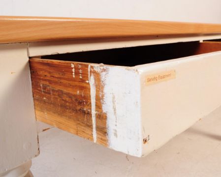 An early 20th church painted pine office / writing table. Rectangular form with with replacement contemporary veneered plywood top. Painted pine frame with twin drawers with shape metal pull handles on turned legs. Measures approx 78 x 153 x 91 cm.