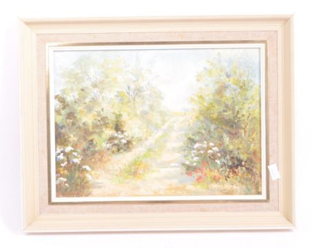 Phillis Cridland - Vintage 20th century oil on board painting. Depicting a country lane flanked by floral / foliate banks. Near Staplefield, Sussex. Signed bottom right, framed. Measures approx. 30cm x 38cm