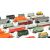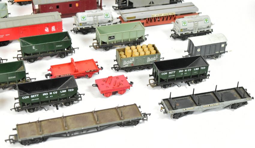 Model Railway - a collection of assorted OO gauge model railway trainset locomotive rolling stock wagons to include tankers, grain vans, mobile crane, cement wagons and more.