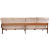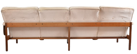 Guy Rogers - A retro 20th century British design teak framed four seater sofa settee. The sofa with salmon coloured button backed upholstery with cushioned seat and backrests and padded arms. The sofa raised on straight teak supports. Measures approx. 81cm x 237cm x 87cm.