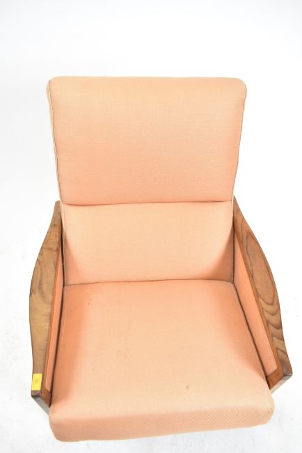 A Danish inspired retro mid 20th century teak framed easy lounge chair. The armchair in pink upholstery with cushioned back rest & seat. Shaped propeller elbow rests on shaped supports. Measures approx. 85cm x 72cm x 71cm.