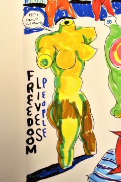 Daniel Johnston was a prolific visual artist and musician. He gained a cult following in the 1990s when Kurt Cobain wore a T-shirt with the artist’s frog illustration from his Hi, How Are You (1983) album cover to the MTV Video Music Awards. Johnston’s art was inextricably connected to his music, and his pen and marker drawings of superheroes and anthropomorphized animals were critical to his cult appeal among music fans and art aficionados alike. Johnston lived with schizophrenia and bipolar disorder, which contributed to his work’s on-and-off categorization as outsider art; his visionary world-building and use of religious symbolism echoed the poems and engravings of William Blake. Johnston’s paintings and drawings have been exhibited in Los Angeles, Zurich, and Berlin, as well as at the 2006 Whitney Biennial in New York. The previous year, he was the subject of the award-winning documentary The Devil and Daniel Johnston.
