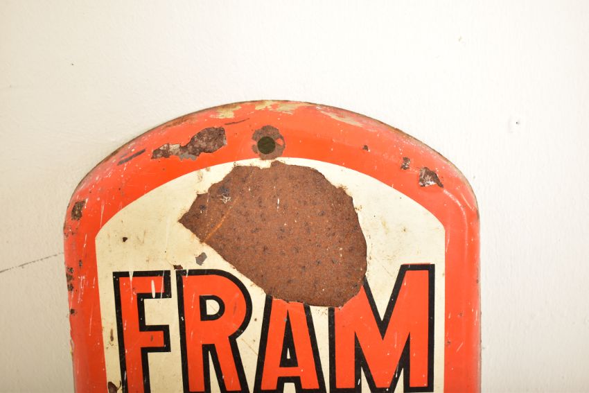 Fram - A vintage mid 20th century American porcelain enamel advertising thermometer sign. The sign of round rectangular form and red and white ground, central thermometer section and notations reading 'Fram Filter Service'. Made in the U.S.A Fram Corp Providence 16 R. Measures approx. 100cm x 20cm.