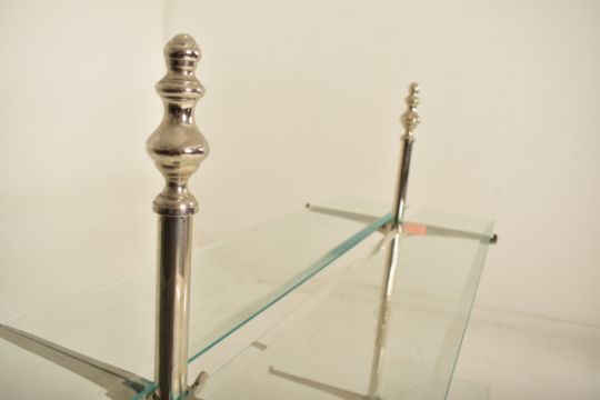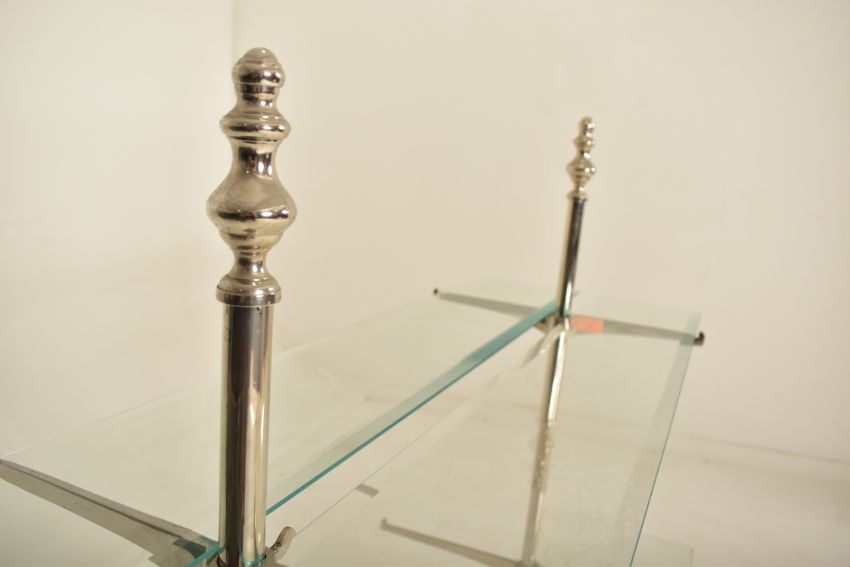 A vintage 20th century Art Deco shop display stand / shelving unit. The display having two chrome upright supports with graduating protruding arms supporting the glass shelves. Each raised on circular bases. Damage to one glass shelf. Measures approx. 104cm x 120cm x 52cm.