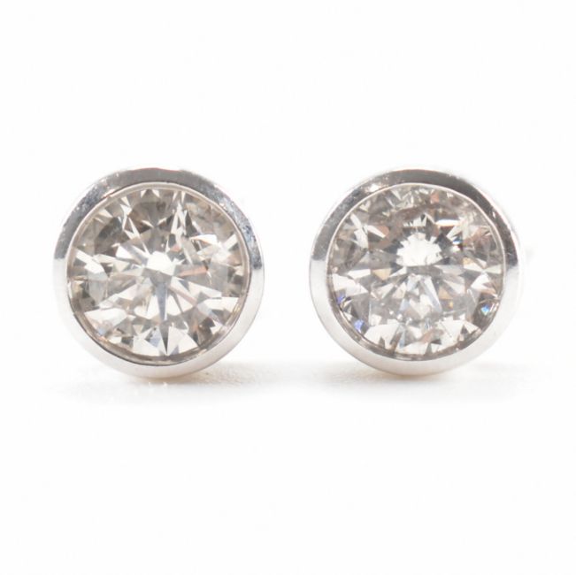 A pair of 18ct gold and diamond earrings. Each earring being bezel set within an 18ct gold mount. Marked 750 to posts. Diamonds measures approx 5.3mm diameter. Weight 2.2g. Diamond estimated approx 0.60ct each. Head measures approx 6.2mm. All weights, measurements and sizes are approximate.