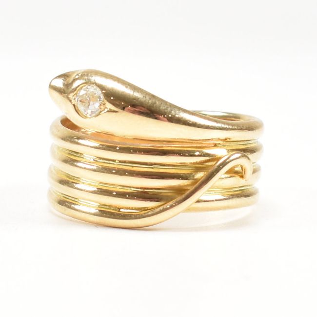 A Victorian hallmarked 18ct gold and diamond snake ring. The ring in the form of a coiled snake having an old cut diamond set to the head. The ring hallmarked for Birmingham 1889. Estimated diamond weight 0.20ct. Weight 13.1g. Size W.5. All weights measurements and sizes are approximate.