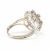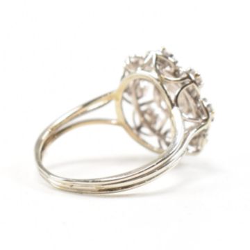 A French 18ct white gold and diamond cluster ring. The ring having a central round cut diamond surrounded by a suspended halo of round cut diamonds to form a flower head on double split shoulders to a banded tapering shank. Stamped French owl mark. Evidence of resizing to shank. Principle stone measures approx 6x5.9x3.5mm. Total weight approx 4.0g. Approx size N. Head measures approx 16.3mm. All weights measurements and sizes are approximate.