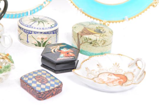 Collection of period 19th century and later ceramic / porcelain / glass to include cabinet plates, chambersticks, coffee cans, trinket wares and others. Plates measure approx. 24cm