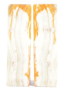A pair of mid century alabaster tribal / African weighted bookends. Each with green white and brown veined colourway with carved busts to each side