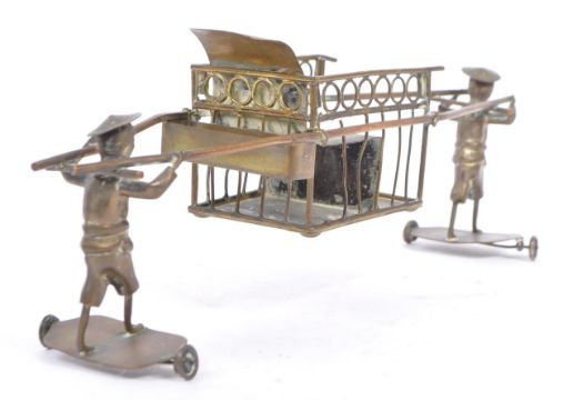 A 20th century circa 1960s bronzed metal Chinese rickshaw articulated cruet stand. The stand being modelled in the form of a two figures carrying a Sedan chair. Measures 28cm length.