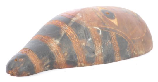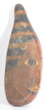 An 20th Century carved husk figural face mask depicting a male face. The face with hand painted decoration with carved facial features. Measures approx; 37cm x 14.5cm.