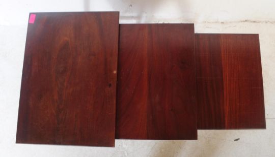 A retro mid 20th century mahogany nest of tables. Of graduating size, rectangular form with upright tapering supports with perimeter stretchers. Measures approx.