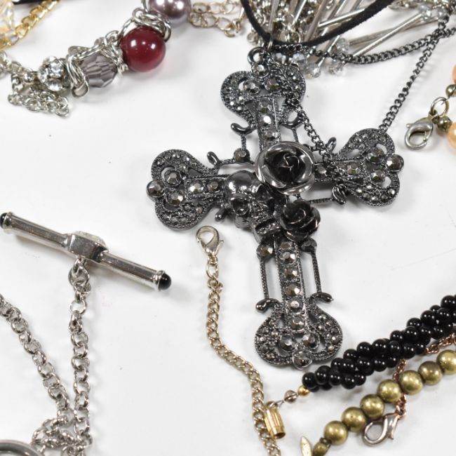 A large collection of unsorted contemporary costume jewellery. The lot to include necklaces, , pendants, chains and earrings. To include gem set, diamantes, simulated pearls,  abalone, filigree and beads. To include branded jewellery Jaeger. Combined weight approx 2566g.