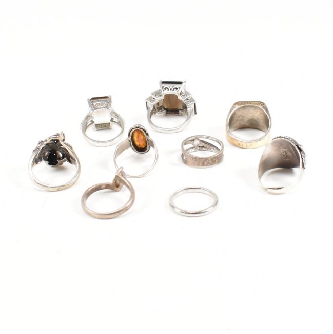 A collection of 925 silver and gem set rings. The rings to include smoky quartz, hematite, paste, band, solitaire, signet, Octopus, floral. Marked 925, hallmarked or tests as silver. Weight 53g. Size range K - Q.5. All weights, measurements and sizes are approximate