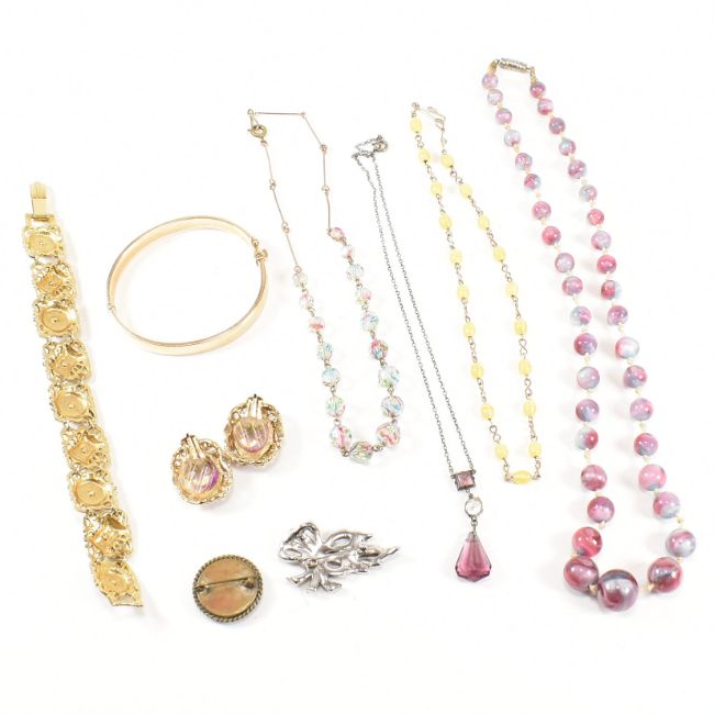 A collection of 1930s glass bead necklaces and costume jewellery. The lot to include three 1930s glass bead necklaces. A pendant necklace. A 1/5th 9ct rolled gold hinged bangle. A butterfly wing brooch. A gold tone and gem set bracelet. A gold tone and gem set clip-on earrings. A marcasite brooch. Necklaces measure longest 54.5cm. Shortest 38.5cm. Rolled gold bangle measures 6.5cm and weighs 11.3g. Bracelet measures 19cm. Brooches measure largest 4.5cm x 3cm. Smallest 2.5cm x 2.5cm. Combined weight 158.7g. All weights, measurements and sizes are approximate.