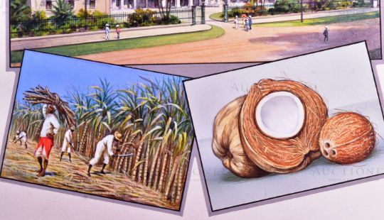 W.D. and H.O. Wills Cigarette Cards (1929) - a piece of highly detailed mixed media original artwork for 'The British Empire' series of 12 postcard sized cards, issued by W.D. and H.O. Wills in 1929. The artwork depicts select themes and images for 'British Guiana'. Mounted on card. Measuring approximately 30 cm x 21 cm including the mount.  W.D. & H.O. Wills was a British tobacco manufacturing company formed in Bristol, England, and it was the first British company to mass-produce cigarettes. It was also one of the founding companies of Imperial Tobacco along with John Player & Sons.