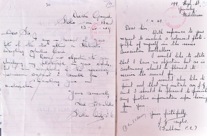 Mardon, Son & Hall - Association Footballers - a collection of letters and receipts from various famous footballers all circa 1949. Each letter / receipt relates to production of a cigarette card (or Weighing Machine card) that is believed to have been unproduced. Letters generally handwritten from the footballer and giving permission or asking for amendments to the artwork being used for their likenesses. Each letter and receipt comes signed by the relevant footballer. Includes: Leon Leuty, Peter Harris, Neil Franklin, Jimmy Mullen, Walley Barnes, Ted Ditchburn, John Carey, Ronnie Dix, JG Taylor, TG Jones and others. Most stamped with Mardon, Son & Hall 'received' stamps dated 1949.