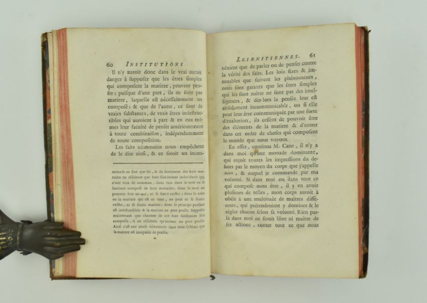 The Monadology of Gottfried Leibiz. 1767 Institutions Leibnitiennes, ou Precis de la Monadologie. Published by Freres Perisse at Lyon, chez Saillant in Paris. Contemp. full calf binding, gilt tooled spine & label, some wear to boards & bumping to extremities, marbled endpapers, pages of annotations in a contemporary hand to ffep, some water staining to first leaves. 8vo.