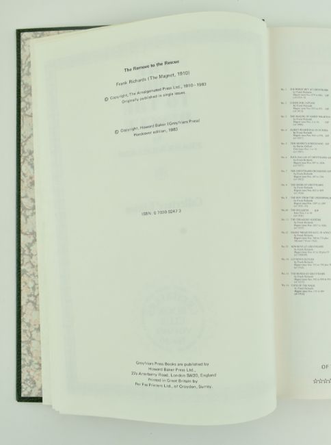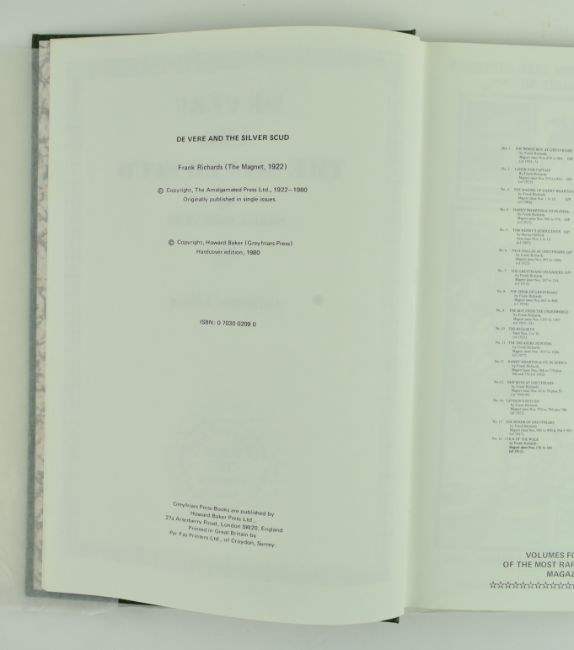 Richards, Frank. A collection of seven signed limited editions for the Greyfriars Book Club. The lot comprising No. 20 Harry Wharton & Co. in Hollywood, No. 21 The Greyfriars Film Stars, No. 68 Greyfriars versus Highcliffe in slipcase and glassine wrap, No. 26 The Toad of the Remove in glassine wrapper, No. 50 The Remove to the Rescue in slipcase, No. 35 De Vere and the Silver Scud in glassine, and No. 30 The Greyfriars Plotters in glassine wrap and slipcase. 4to.