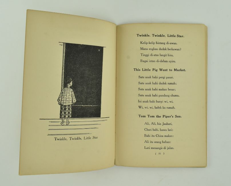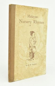 Hamilton, A. W. Undated, circa 1915 Malayan Nursery Rhymes. Illustrations by W. G. Stirling. Printed at the Methodist Publishing House, Singapore. Orig. quarter cloth paper covered pictorial boards, ring marks to front board, extremities bumped. An interesting collection of English children's rhymes translated into Malay, including such as Yankee Doodle, Twinkle Twinkle Little Star, Baa Baa Black Sheep, Jack and Jill, Oranges and Lemons, Hickory Dickory Dock, Old Mother Hubbard and Three Blind Mice, among others. 8vo.