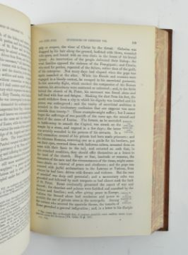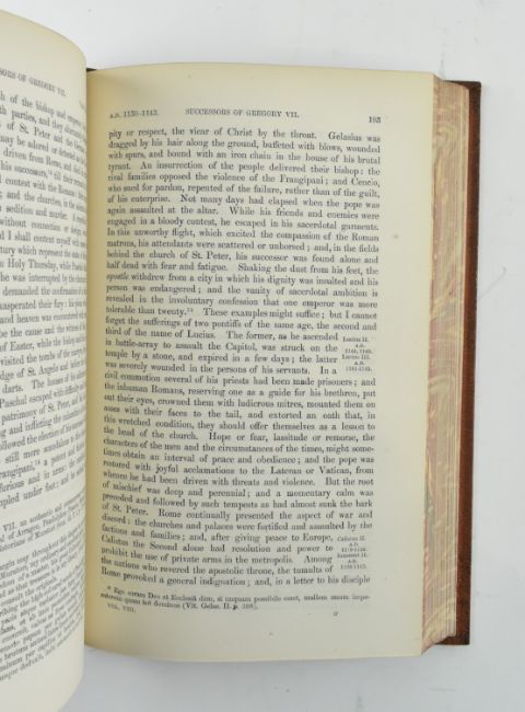 Bickers bindings. Gibbon, Edward - 1862 The History of the Decline and Fall of the Roman Empire in Eight Volumes. With notes by Dean Milman and M. Guizot, new edition with notes by William Smith. With portrait & maps. Publ. John Murray. Full orange calf binding by Bickers & Son London, gilt tooled spines, borders and title labels (loss & damage to spine label of Volume IV, occasional rubbing & discolouration), marbled edges and endpapers. 8vo.