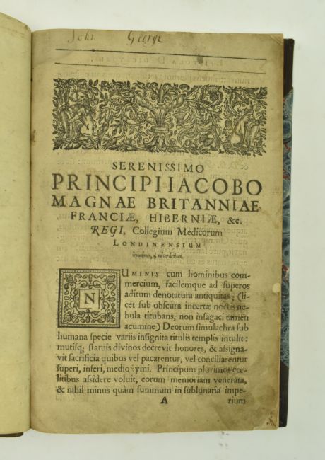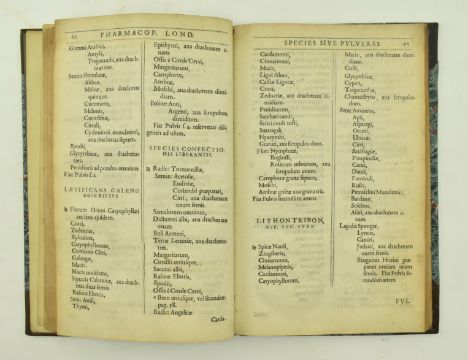 Medicine & herbal interest. 1638 Pharmacopoeia Londinensis Collegarum, Hodie viventum studiis ac symbolis ornatior. Stated fifth edition, printed for Iohn Marriot, 18th March 1638. Recently rebound in half calf with marbled boards, gilt titles to spine and fresh endpapers. Title page with significant loss recently repaired. Contemp. inscriptions throughout the text with translations of the Latin names for the herbs stated in the catalogue, occasional age-toning to margins, two tears and repairs to the last leaf of the text. An uncommon early edition of this important work first published by the Royal College of Physicians in 1617 following a proclamation from King James I, which was the first sanctioned catalogue of herbal drugs, their uses and instruction, and later famously translated from the Latin by Nicholas Culpeper. 8vo.
