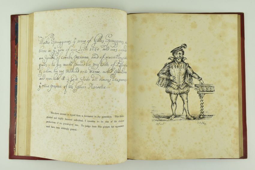 Parker, Francis, Countess of Morley. 1829 Portraits of the Spruggins Family, arranged by Richard Suckletumbkin Spruggins Esq. Privately printed 1829. Illustrated with forty-four caricature engravings. Half calf binding by Tuckett Binder to the Queen, gilt titles and edges,  marbled endpapers with Art Nouveau bookplate to front pastedown, pages occasionally a touch spotted. Large 8vo.