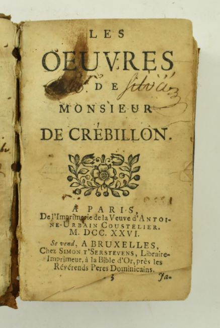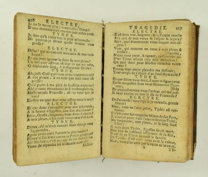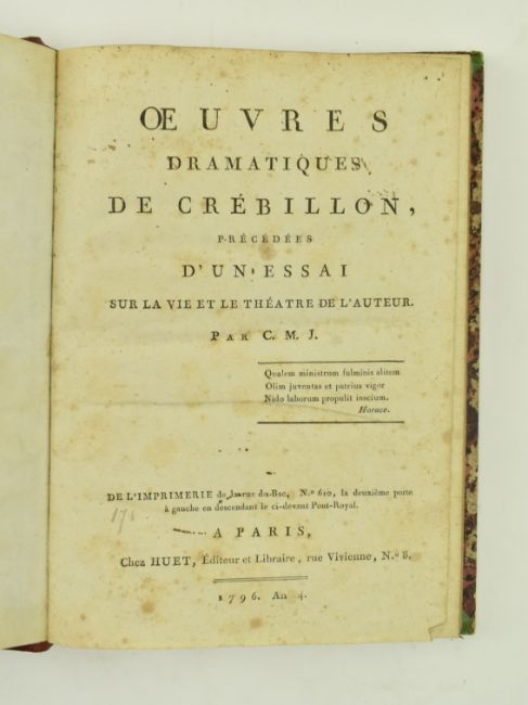 Crebillon, Prosper Jolyot de. Two 18th century French collections of the tragic plays of Crebillon pere. The lot comprising 1726 Les Oeuvres de Monsieur de Crebillon, publ. de l'imprimerie de la Veuve d'Antoine - Urbain Coustelier, Paris 1726. Contemp. full calf binding, gilt tooled spine & titles (loss to head and tail, boards edgeworn), contemp. ownership inscription of Silva to front pastedown, title page & verso and rear pastedown. Contains tragedies Idomene, Atre'e et Thyeste, Electre, Rhadamisthe et Zenobie, Semiramis and Pyrrhus. Along with a later example, being 1796 Oeuvres Dramatiques de Crebillon, with an Essay on the Life and the Plays of the Author by C. M. J. Publ. Chez Huet, Paris 1796. Contemp. quarter crushed morocco binding with marbled boards, gilt tooled spine & titles (lightly bumped to edges, odd spot to leaves internally). Two early collections of Crebillon pere's tragedies, considered by some a greater writer than Voltaire.
