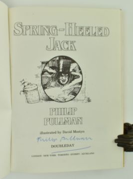 Pullman, Philip. Three signed first edition illustrated children's books, all signed in blue biro to title page. The lot comprising 1989 Spring-Heeled Jack, a Story of Bravery and Evil publ. Doubleday illustrated by David Mostyn, 1994 The New Cut Gang - Thunderbolt's Waxwork publ. Viking illustrated by Mark Thomas, and 1995 The New Cut Gang - The Gas-fitter's Ball also publ. Viking illus. Mark Thomas. All in publisher's original pictorial laminate boards, ex-library with renewed endpapers, light bumping to extremities, ex lib stamps to title pages but otherwise very smart. 8vo.