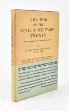Second World War interest. 1942 The War on the Civil & Military Fronts: The Lees Knowles Lectures on Military History for 1942 by Major-General G. M. Lindsay. Signed by author George Lindsay to ffep 14/8/43. Presented in original unclipped dust wrapper complete with advertising wrap around band 'The Book for Civil Defence Committees & Home Guard', denoting it 'The first book on the co-ordination of the civil and military forces for the defence of this country, written with the authority of a Deputy Regional Commissioner. Publisher's orig. smart full cloth binding, dust wrapper with light wear to the head of the spine, which is a touch sunned, otherwise in excellent condition. 8vo.