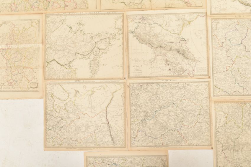 A collection of eleven 19th century maps of Russia and Siberia, some hand-coloured or with coloured borders. The lot including eight examples by J. & C. Walker, a map of Muscovy or Russia in Europe by Barlow, and an example of the Russian Empire and the Acquisitions of Russia since the accession of Peter the Great in 1689 engraved by Edward Weller and published by Blackie & Son. Largest measures approx. 54cm x 37cm.