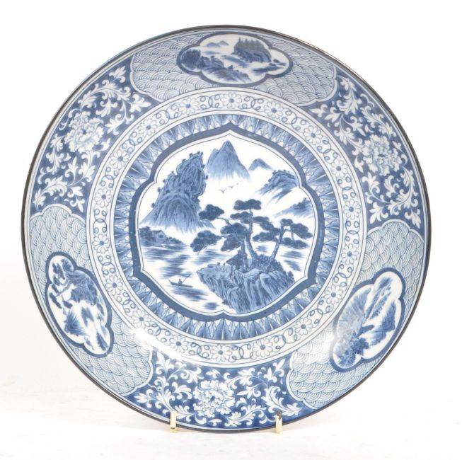 A collection of 20th Asian Chinese / Japanese porcelain china items. To include three lidded blue and white pots. Hand painted lidded circular jar, square ornate dish. With a large blue and white bowl / plate with landscape scene to centre with panelling. Measures approx. 30cm diameter.
