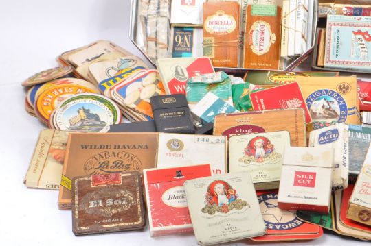 Breweriana & Tobacciana Interest - A large collection of mid 20th century and later tobacco smoking & drinking ephemera to include cigar/zigarillos boxes/tins - Willem II, Nervenbuh Menieff, Pefef, Audax, Carl Upman.Cigarette boxes/tins to include Wild Woodbine (with full content), Windsor, Park Drive, Belair, Caporal, Stop, Mura, King Erik amongst many others. Includes a large number of beer mats, along with three Brook Bond & WD & HO Wills cigarette card books and a number of loose cards.