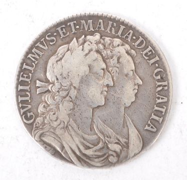 A William & Mary 1689 silver half crown coin.